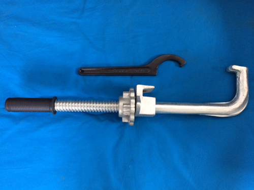b:勾型扳手外鎖式,用手將手輪旋到手把處,卡軌塊移到手輪處,鉤鎖器鉤頭從鋼軌外底部穿過,鉤頭鉤住尖軌軌底,把卡軌塊推到鋼軌處,用手轉動手輪到卡軌塊,用鉤型扳手扭緊,對準鎖孔上鎖即可,拆除反方向才做即可。