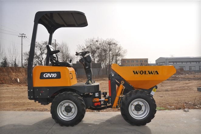 微型翻斗車主要由料斗和行走底架組成,借助斗內物料的重力或液壓缸推力傾翻卸料。卸料按方位不同,分前翻卸料、回轉卸料、側翻卸料、高支點卸料(卸料高度一定)和舉升傾翻卸料(卸料高度可任意改變)等方式。